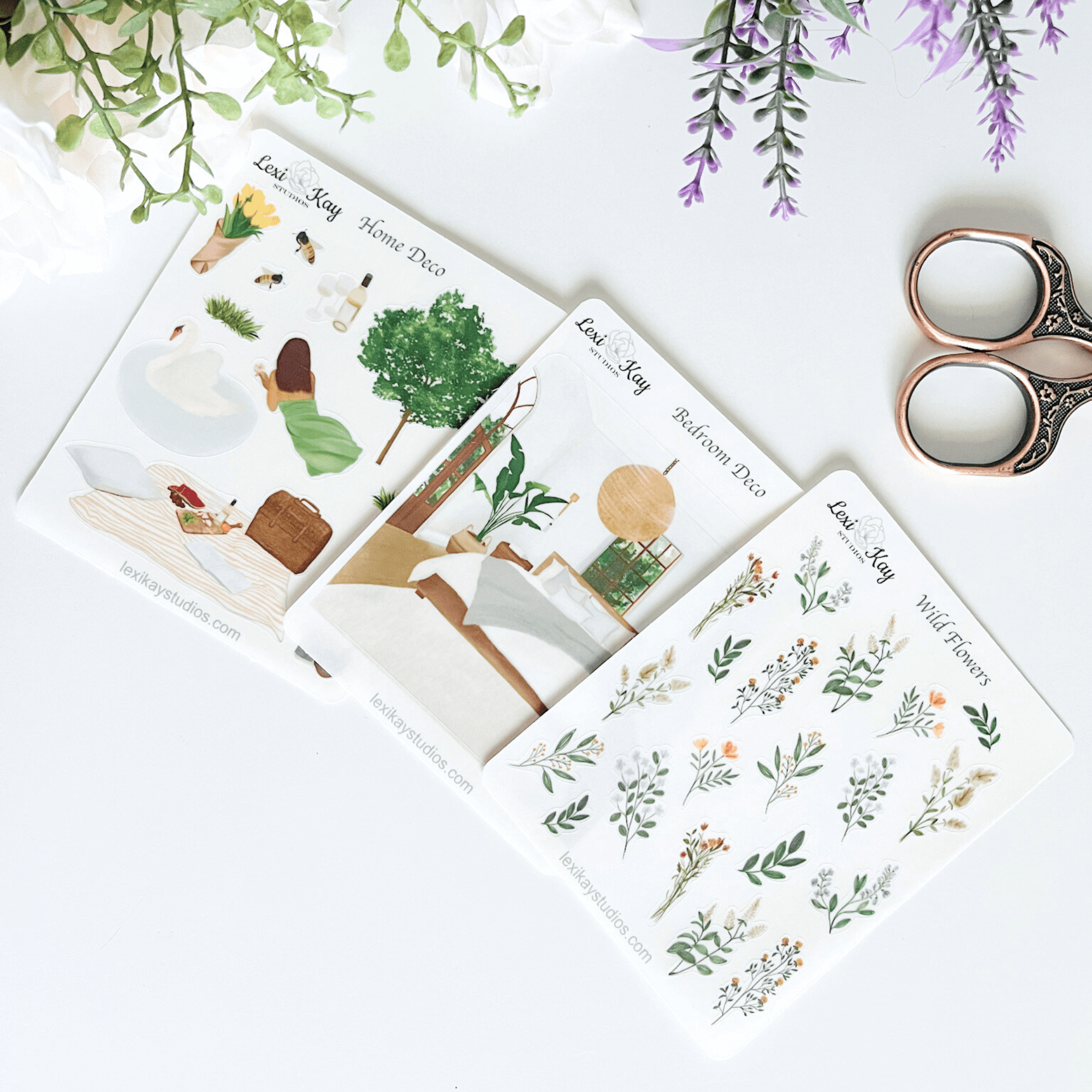 Add flair to your planner or journal with our charming hand-drawn sticker sheet inspired by the lush greens of spring.